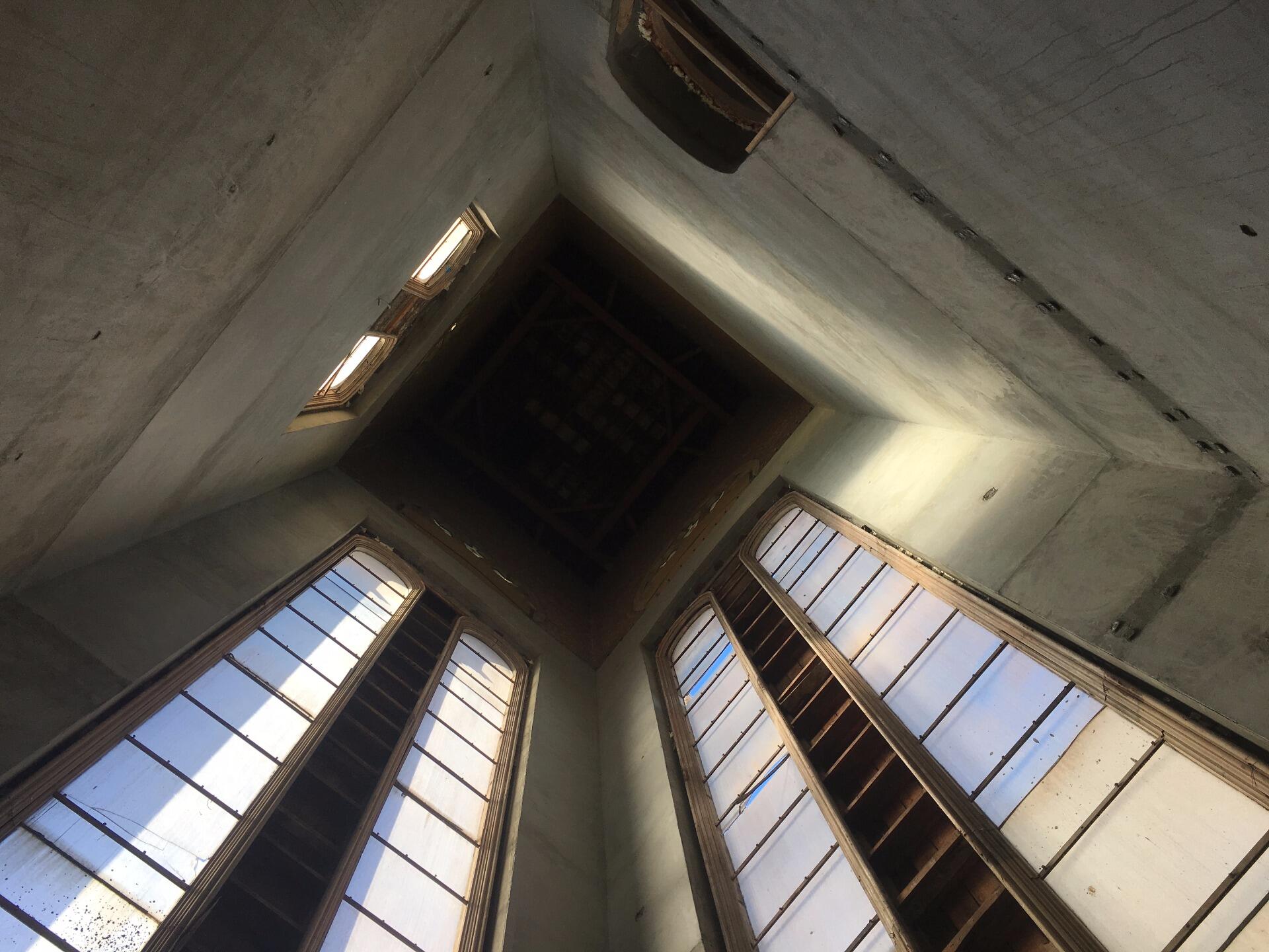 The towering, abandoned high school located centrally in a city in California. Closed due to flooding. The windows are continuously painted white, creating a dim glow in the interior.